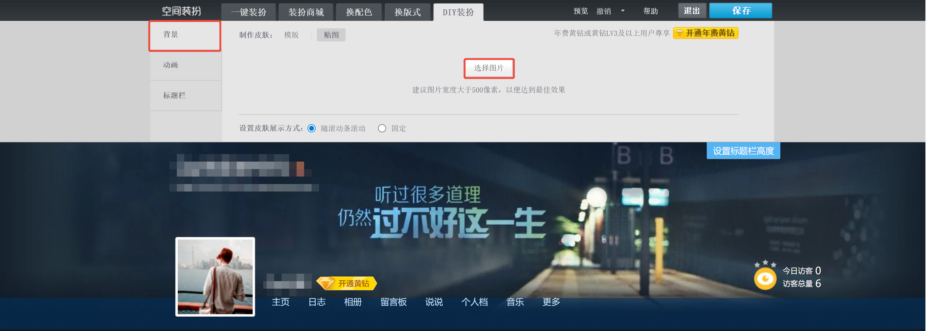 可支持上传自己的照片作为空间背景,支持从空间相册选择、从电脑本地选择以及上传在线图片URL。